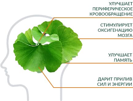 Экстракт гинкго билоба помогает в нормальной оксигенации мозга, поддерживает мозговое кровообращение и защищает нервные клетки, способствуя нейтрализации свободных радикалов.
